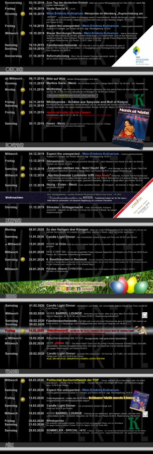 Bei Feierlichkeiten stehen wir Ihnen nach Absprache rund um die Uhr zur Verfügung! Wenn Sie abweichende Zeiten benötigen, so bitten wir um entsprechende Reservierungen.